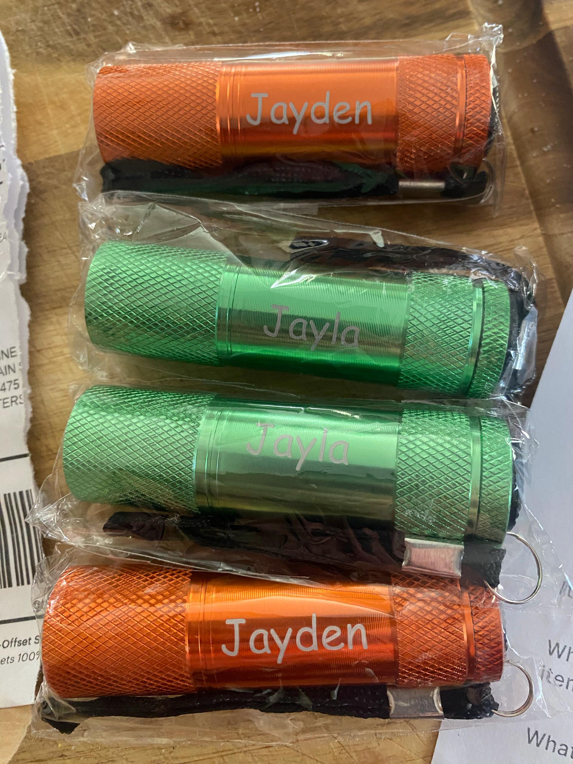 Our great multi LED anodized aluminum flashlights can be engraved with your text or logo and are super bright!