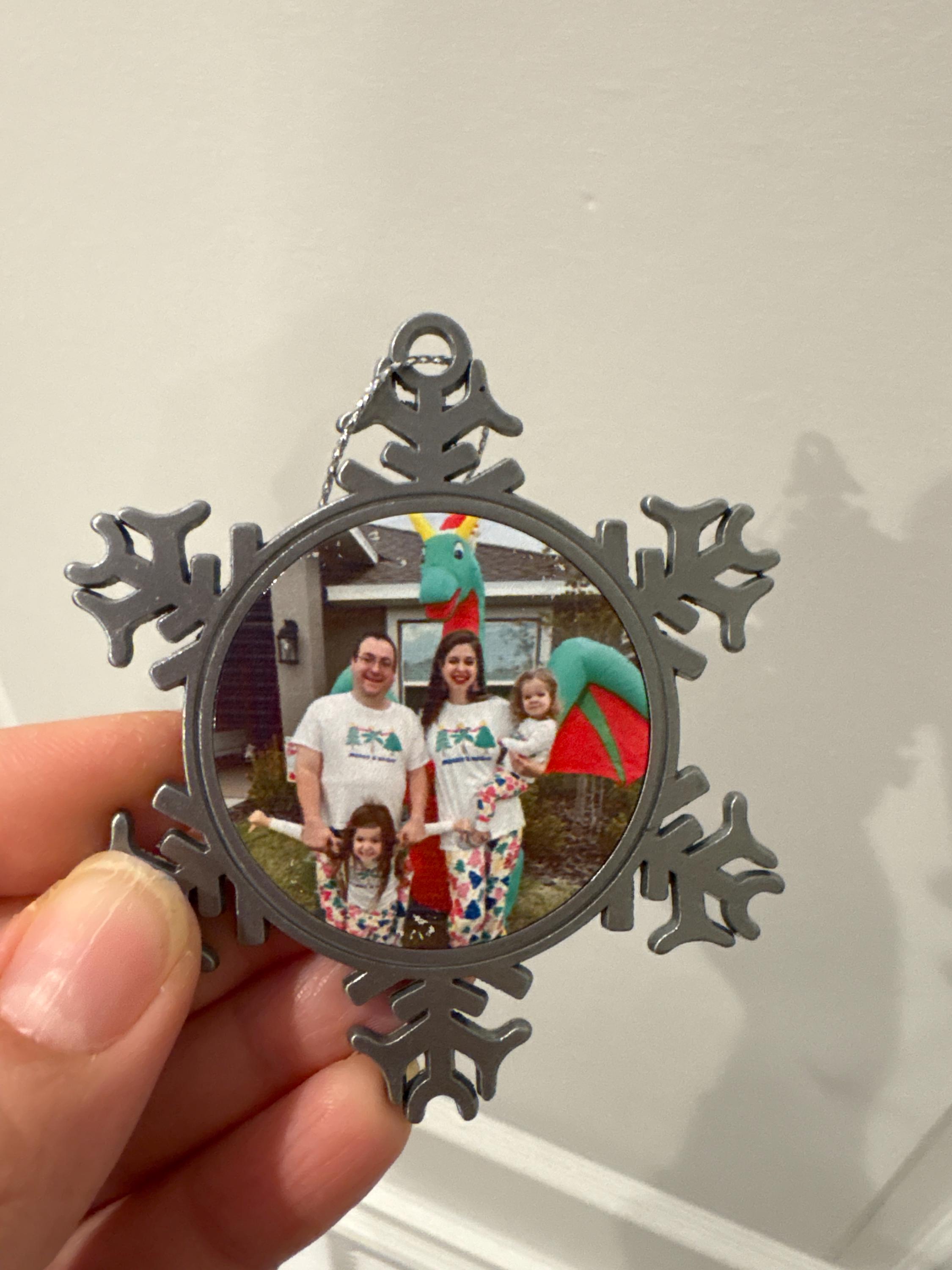 We’ve gotten a snowflake ornament every year since 2019! We do the same photo of our family in that year’s matching pajamas on Christmas in front of our inflatable Christmas dragon! Jonathan and Koihana send us a personalized note because we are repeat customers, and it is so sweet and does not go unnoticed! I love our collection of ornaments showing our growing family!